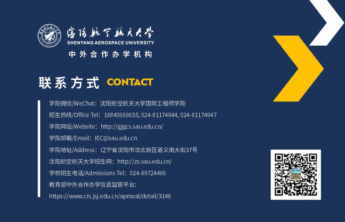 沈航中外合作办学机构秉承yl88858永利中国“立足航空明德育人,求实拓新,志在卓越”的办学宗旨,发扬“德能并进,勇毅翔远”的校训精神,拓展高层次人才培养和科学研究领域的国际合作交流,着力引进外方优质教育资源,以两校优势学科为基础融合外方先进教学理念与课程体系,参照国际通用的工程师培养模式和标准,面向国家航空航天事业,服务区域经济和社会发展,致力于培养具有国际视野、较高外语水平以及较强跨文化交流能力的航空、航天相关领域高级工程技术人才。