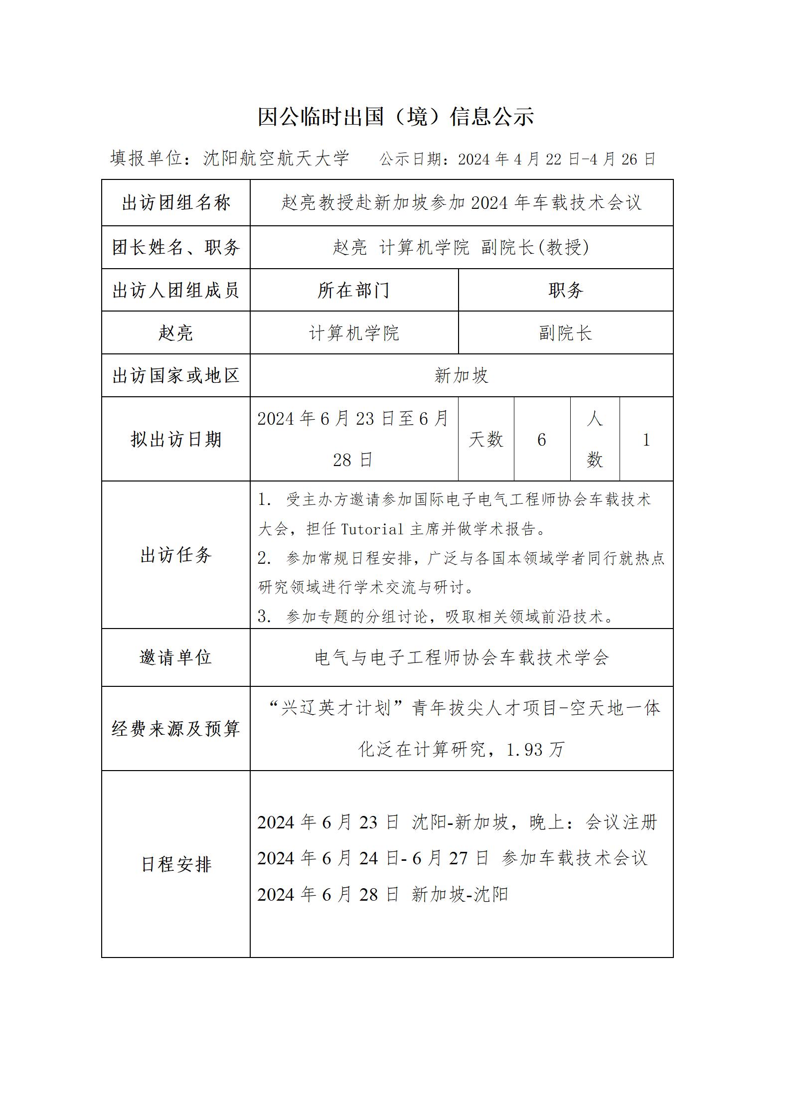 应电气与电子工程师协会车载技术学会的邀请,我校拟组派赵亮同志于2024年6月23日至6月28日赴新加坡参加2024年车载技术会议。按照省外办有关最新管理规定,现就此计划予以公示。公示日期:2024年4月22日-4月26日。如有异议,可在公示期内与外事处联系,电话:024-89724878,邮箱: foreignaffairs@sau.edu.cn 。