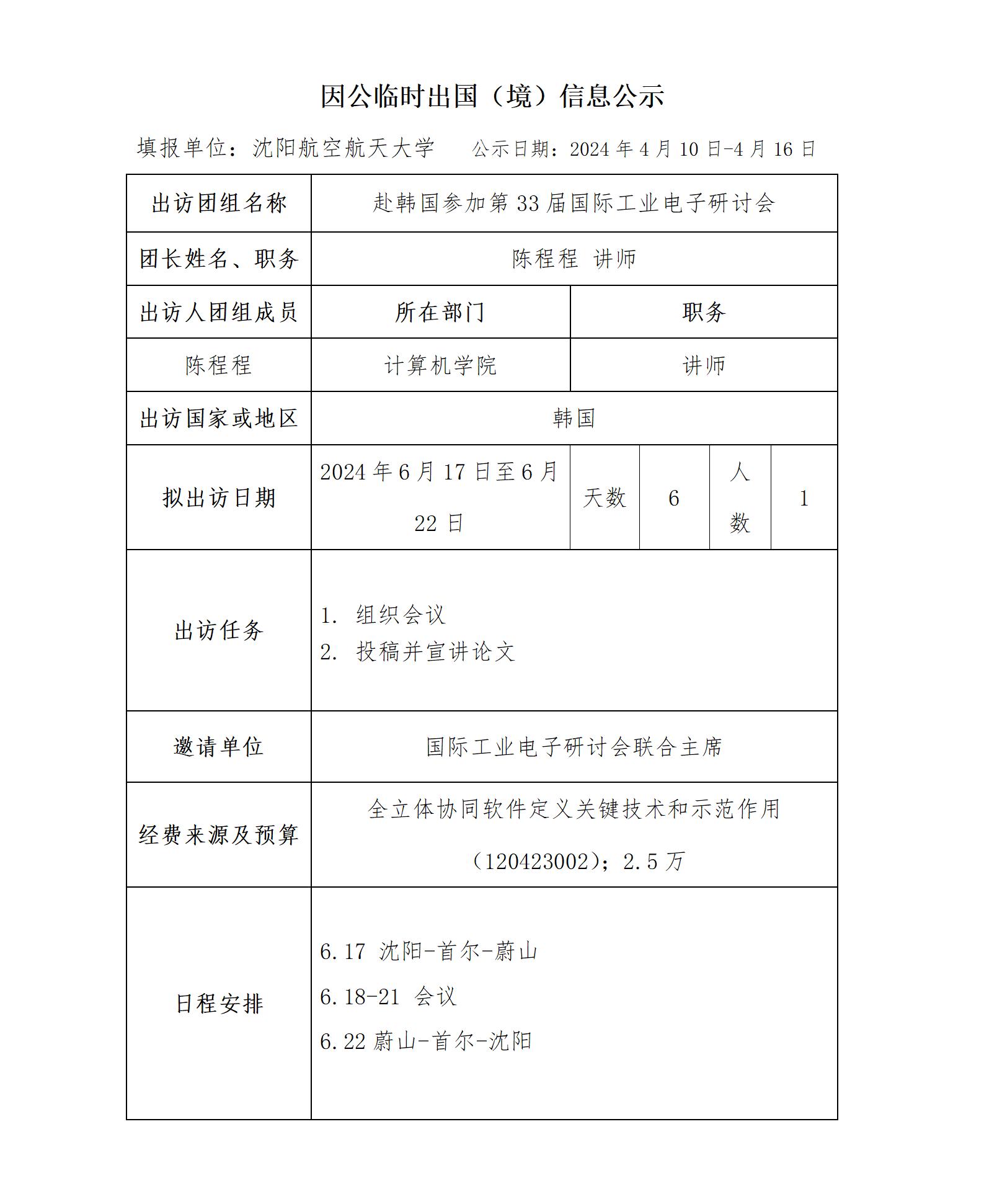 应国际工业电子研讨会联合主席赵康贤的邀请,我校拟组派陈程程同志于2024年6月17日至6月22日赴韩国作为特邀会议组织者参加2024年第33届国际工业电子研讨会,并做会议报告。按照省外办有关最新管理规定,现就此计划予以公示。公示日期:2024年4月10日-4月16日。如有异议,可在公示期内与外事处联系,电话:024-89724878,邮箱: foreignaffairs@sau.edu.cn 。